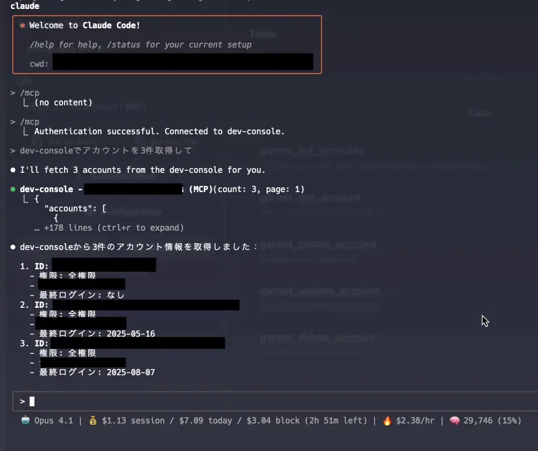 こちらも認可コードフロー完了後、プロンプトで指示すると意図通りの挙動になることを確認できました。